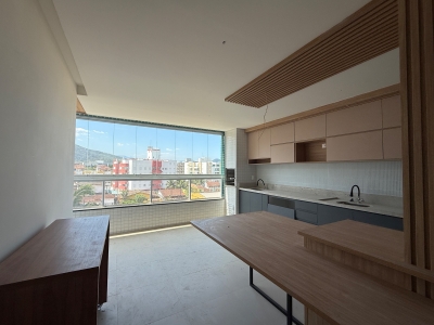 Conta com 2 dormitórios, sendo 1 suíte, além de banheiro social. A área social é integrada, com sala de TV e jantar, cozinha com balcão americano e ar-condicionado, proporcionando conforto e funcionalidade no dia a dia.