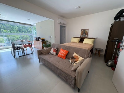 O imóvel está no segundo andar, com posição de sol da manhã, e conta com dois dormitórios, sendo uma suíte, além de um banheiro social. Possui varanda gourmet com churrasqueira e encontra-se totalmente mobiliado.